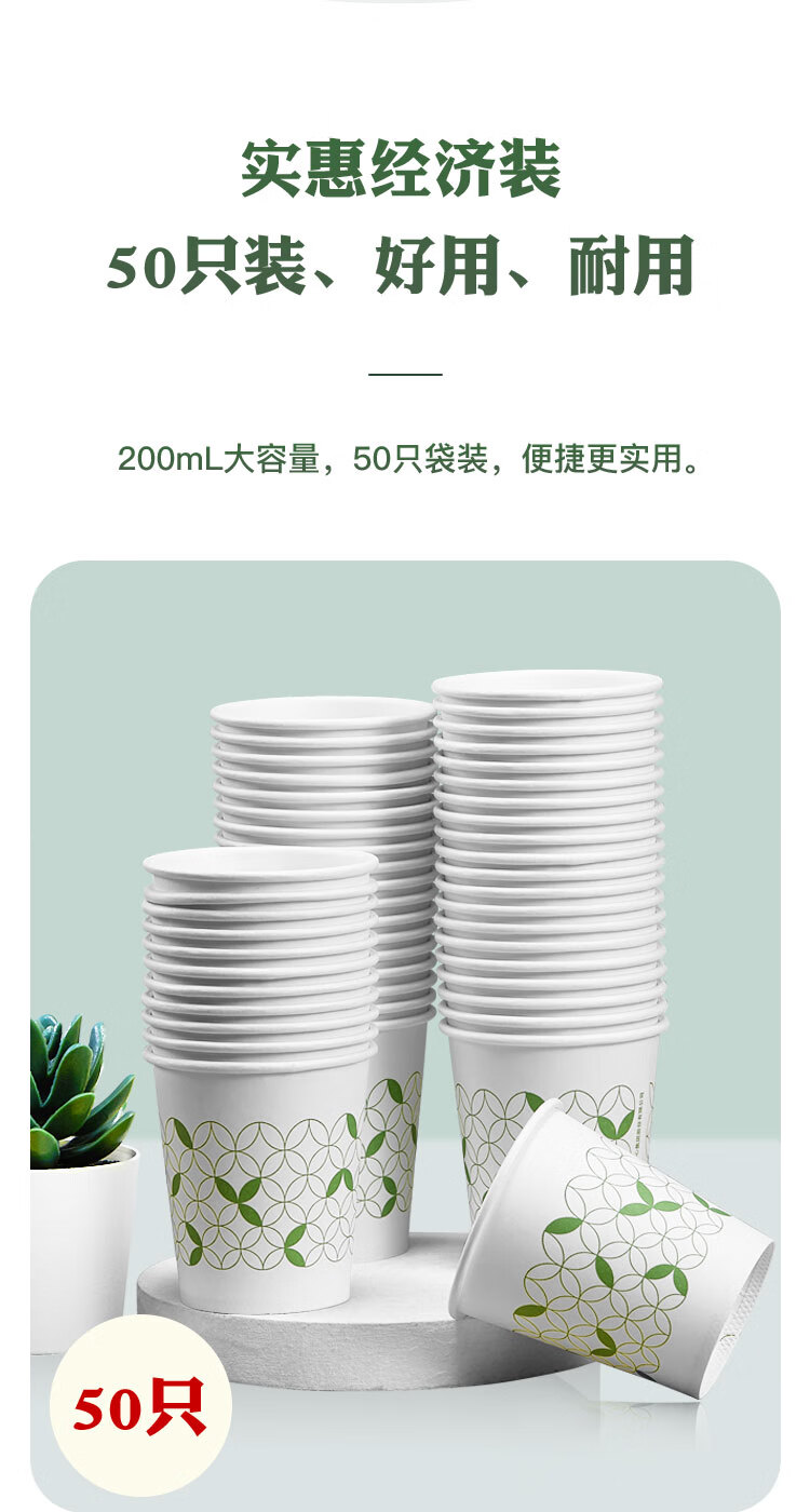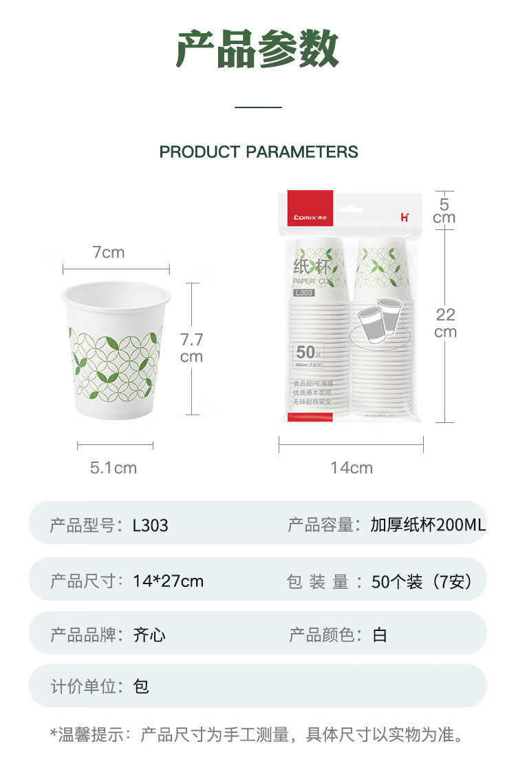 齐心(Comix)50个装200ml 7盎司加厚一次性水杯/纸杯 办公文具 L303