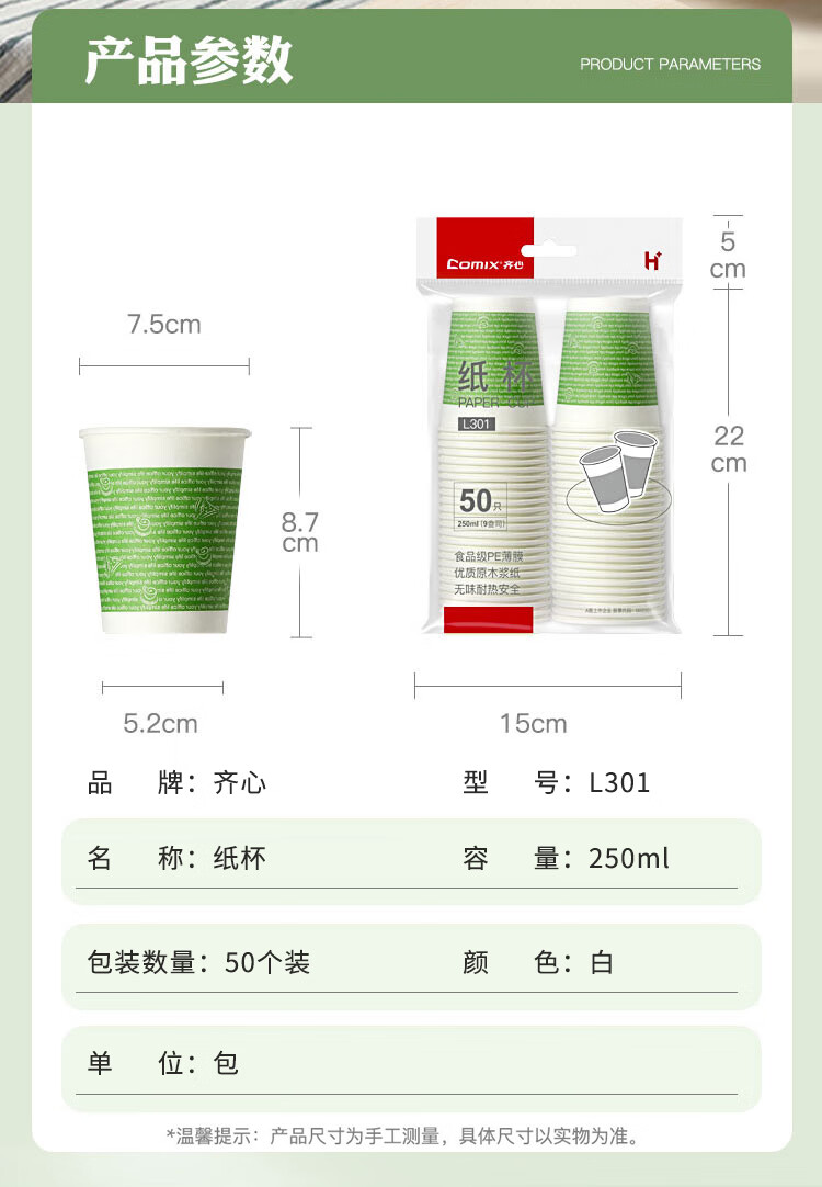 齐心(Comix)加厚一次性水杯/纸杯 50个装250ml 9盎司 办公用品 工具 L301