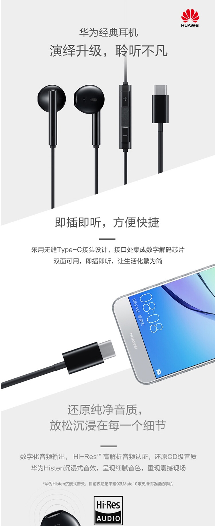 华为原装Type-C耳机华为经典耳机CM33 黑色